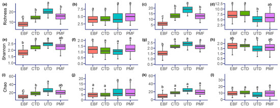The difference in species richness (a–d), Shannon–Wiener index (e–h), and Chao’s index (i–l) between forest types for all species (a,e,i), adults (b,f,j), saplings (c,g,k), and seedlings (d,h,l) on a small scale. Different letters denote the significant differences between forest types according to the linear mixed effect models. Pink boxes represent evergreen broad-leaved forests (EBF); green boxes represent the infected Masson pine forests in 2016 and selective cutting of infected trees (CTD); blue boxes represent the infected Masson pine forests in 2016 and retention of infected trees (UTD); purple boxes represent the Masson pine forests (PMF).