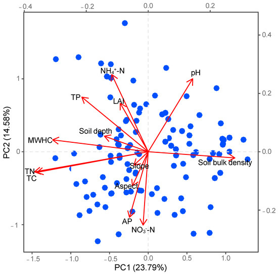Principal component analysis (PCA) for 13 environmental factors on a large scale. The environmental factors include soil bulk density (g/cm3), maximum water holding capacity (MWHC, g/kg), ammonium nitrogen (NH4+-N, mg/kg), nitrate nitrogen (NO3−-N, mg/kg), total carbon (TC, %), total nitrate (TN, %), total phosphorus (TP, mg/kg), available phosphorus (AP, mg/kg), soil pH, slope, aspect, canopy openness (LAI, %), and soil depth (cm).