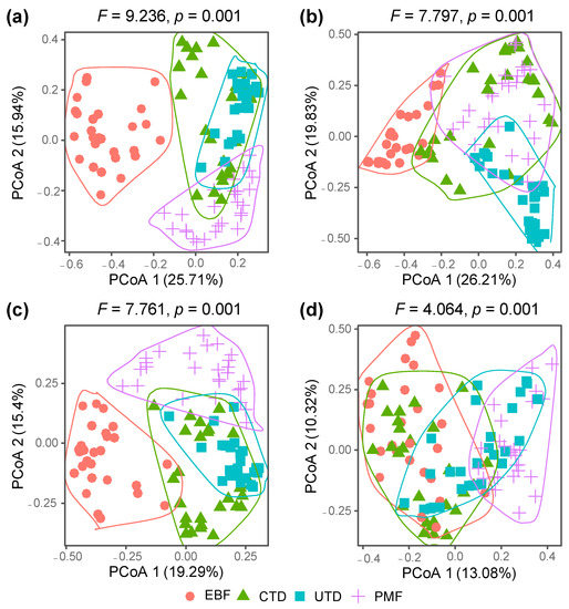 The ordination of (a) all species, (b) adults, (c) saplings, and (d) seedlings communities by principal coordinate analysis (PCoA) on a large scale. Ellipses show 75% confidence limits within each forest type (EBF: evergreen broad-leaved forests; CTD: infected Masson pine forests in 2016 and selective cutting of infected trees; UTD: infected Masson pine forests in 2016 and retention of infected trees; PMF: Masson pine forests). Two dimensions and Bray–Curtis distance were applied in the analysis. Points close together in principal coordinate analysis (PCoA) ordination space indicate plots with similar species composition.
