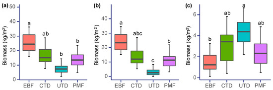 The differences in mean biomass among forest types for all tree species (a), adults (b), and saplings (c) on a small scale. Different letters denote the significant differences between forest types according to the linear mixed effect models. Pink boxes represent evergreen broad-leaved forests (EBF); green boxes represent the infected Masson pine forests in 2016 and selective cutting of infected trees (CTD); blue boxes represent the infected Masson pine forests in 2016 and retention of infected trees (UTD); purple boxes represent the Masson pine forests (PMF).