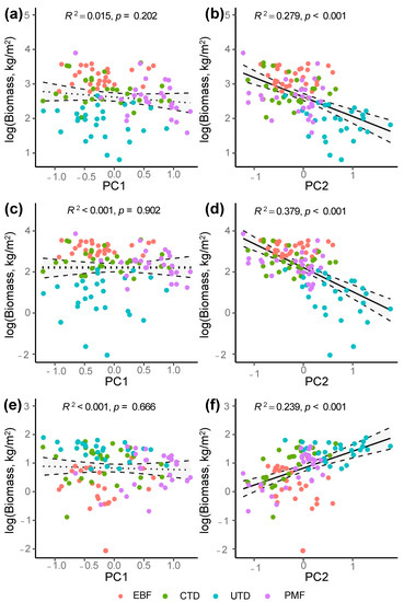 Differences in biomass across forest types showed similar patterns on a small and large scale (Figure 6 and Figure A5). The EBF had the highest biomass compared to other forest types (PMF, CTD, and UTD), and the UTD had the lowest biomass for all species (Figure 6a) and adults (Figure 6b) but the highest for saplings (Figure 6c). There were no significant differences in biomass for all species (Figure 6a), adults (Figure 6b) and saplings between CTD and PMF. There were significant negative correlations between PC2 and the biomass for all species (Figure 7b) and adults (Figure 7d), while there were positive correlations between PC2 and the biomass of saplings (Figure 7f) on a small scale. There were significant negative correlations between PC1 and the biomass for all species (Figure A6b) and adults (Figure A6d) on a large scale.