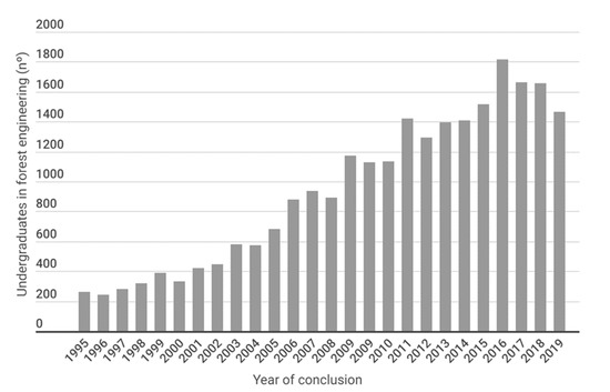 Figure 3. Increasing numbers of graduates per year in forest engineering programs from 1995 to 2019 in Brazil.