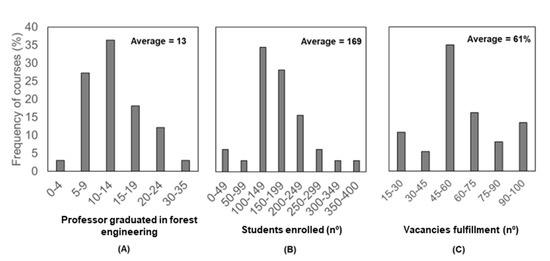Figure 4. Frequency of courses provided by: (A) the number of professors who graduated in forest engineering, (B) Number of students per program, and (C) Vacancy fulfillment (%), showing an enormous heterogeneity of theses variables among the programs.