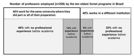 Another survey conducted in collaboration with organizations within the forestry sector showed that 100% of respondents indicated a lack of professionals with the skills required to deal with real-world challenges [45]. This finding highlights a clear mismatch between the supply of professionals in the country’s history and the actual demands of the forestry sector, which lacks professionals with soft skills, which refer to the person’s ability to interact effectively with others, communicate, and work well in a team [50]. Our study reveals several potential factors contributing to this issue. Notably, the discrepancy in the number of professors (Figure 4), reflecting variations in university structures, may be one of the underlying causes. Additionally, the number of professors lacking experience outside academia and remaining employed at the same institution where they graduated (Figure 6) could also contribute to the lack of connection between students and the professional job market.