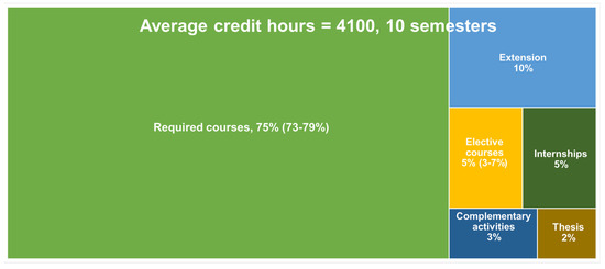 In this study, we analyzed 33 programs, and we conducted interviews totaling roughly 4100 h, spread across ten semesters. Of this total, 75% consists of required courses, 10% focuses on forest extension, 5% involves internships and optional programs, 3% includes complementary activities, such as participation in events or extracurricular activities, and 2% is dedicated to preparing the thesis (Figure 7).