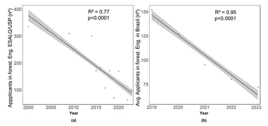 Figure 8. (a) Applicants for admission to the forest engineering program at the University of São Paulo. (b) A similar trend for the Federal Universities in Brazil.