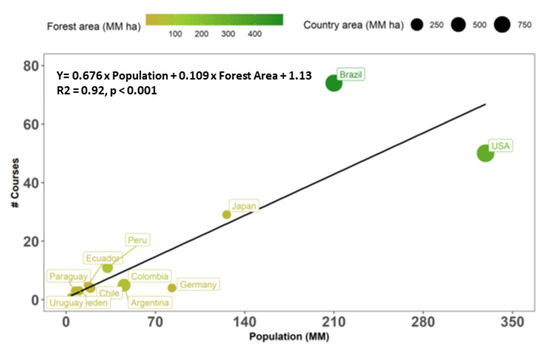 The countries evaluated showed between 1 and 75 forest science programs, and we found a direct relationship between the number of programs (dependent variable) and the population of each country (R = 0.76, p < 0.003), the total area of each country (R = 0.77, p < 0.003), and the forest cover area (R = 0.89, p < 0.001). The best relationship was found when the combined population and forest area were correlated with the number of programs (Figure 9). No relationship was found with the other variables in Supplementary Table S1. In this study, we did not have information on the exact number of students per program, but only the number of programs.