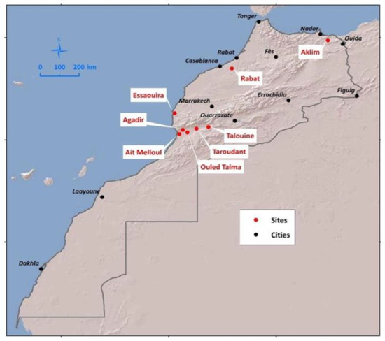 Eight sites of argan trees located in the northeast region (Aklim/Benisnassen), northwest region (Rabat/Oued Cheratt), and center-west region (Agadir, Ait Melloul, Essaouira, Ouled Taima, Talouine, and Taroudant), were prospected. These stations represent different eco-geographical and climatic conditions in Moroccan argan ecosystems (Figure 1).