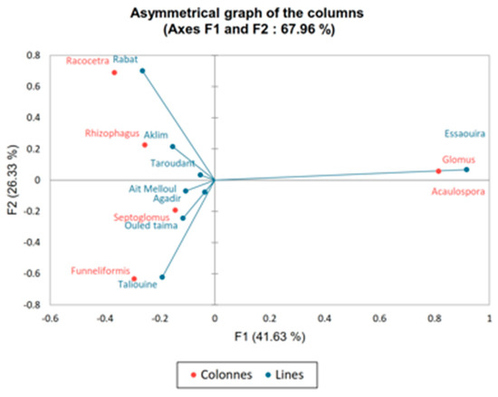 Factorial analysis of correspondences (FAC) showed a highly significant correlation between the sites and genera of AMF (p < 0.0001). Furthermore, it subdivided the sites into two classes: Class 1 (Taliouin, Oueled Taima, Ait Melloul, Agadir, Aklim, Taroudant, and Rabat) and Class 2 (Essaouira) (Figure 5).