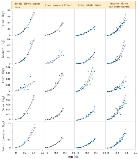 9]. Additionally, equations for each component are typically estimated separately, without considering the inherent correlation among biomass components measured in the same sample trees. To address this issue and account for the inherent correlation between each component and total biomass, various forms of compatible biomass models have been proposed domestically and internationally to ensure additivity between component and total biomass [