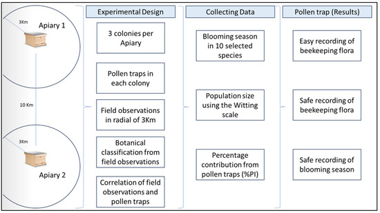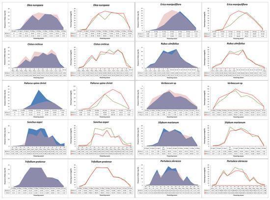The use of natural resources (nectar for energy and pollen for growth) to feed honeybee colonies and produce honey is one of the main factors in successful beekeeping at a professional level [1,2]. For this reason, beekeepers schedule the growth of their colonies and seasonal management (e.g., transfers of hives, dividing colonies, production of hive products, etc.) based on the beekeeping flora of an area. Honeybees forage a large number of plants, but it still remains under discussion that there is a probable relation between bees’ preferences for a pollen source and its availability linked to flower features, such as architecture, color and odor [3,4,5], with Liolios et al. [6] highlighting the population size of beekeeping plants surrounding an apiary as the major factor affecting this relation.