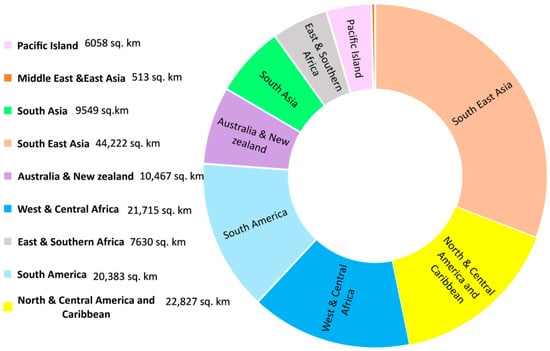 Mangroves are varyingly distributed in 118 countries and terrains, occupying a total area of 147,000 km2 of the world [26]. Figure 1 shows the global mangrove forest distribution. Around 75% of the total mangrove population is concentrated in 15 countries [27], of which only 6.9% thrive in protected areas [28]. The majority of mangroves exist in the Southeast Asian region, particularly in Indonesia, Malaysia, and Myanmar [29].