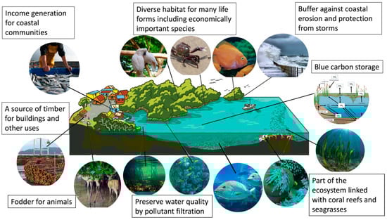 There are several functions of mangrove forests other than as habitats for flora and fauna: They act as a carbon sink (blue carbon storage) [141], maintain water quality [142], protect coastal land from natural disasters [143], and support coral and seagrass ecosystems [144] (Figure 2). In addition, mangroves provide livelihood opportunities for coastal communities through aquaculture, fodder, timber, and ecotourism [8].