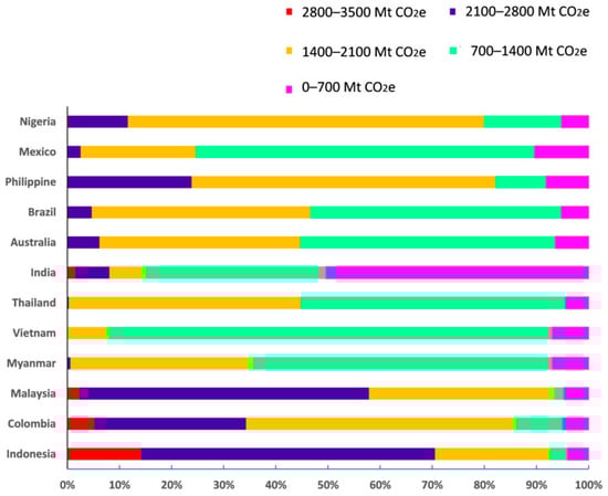 Above-ground carbon storage capacity of mangrove forests in different countries in 2020. Each country has mangrove forests with different carbon storage capacities, which are presented in ranges of carbon storage measured in metric tons of equivalent carbon (Mt CO2e) with each range represented by a different colour. The x-axis is a scale bar of the percentages of the total forests in each country that fall into each carbon storage range. (Data sourced from GMW, 2022).