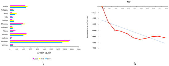 Mangrove forests are home to some of the world’s most endangered plant species [202] (Table 2). Deforestation is aggressively practiced in many mangrove areas for the purpose of land use for farming, aquaculture, and coastal development [203]. Over one-third (35%) of total mangrove populations have been lost over the past 50 years [17]. Asia has contributed to 36% of the mangrove losses so far [204]. Figure 4a illustrates the mangrove loss in the twelve affected countries, documented in the years 2010, 2015, and 2020. Mangrove losses are highest in Indonesia, followed by Myanmar and Australia. The rate of mangrove loss over the last decade was estimated at 0.04% per year globally [205] and surpasses the losses of tropical rainforests and coral reefs, the two other most highly threatened ecosystems [206]. According to Global Mangrove Watch, the global area of mangroves has decreased by 5245.24 km2 from 1996 to 2020 [150,207], as shown in Figure 4b. Among the 64 species of mangrove plants in the world, a total of 12 species have been declared threatened species by the International Union for Conservation of Nature (IUCN) Red List [208] (Table 4). Interestingly, although the African continent has several mangrove areas, all of the species are listed as “least concern” in the ICUN red list, with none mentioned as critically endangered, endangered, vulnerable, or near threatened.
