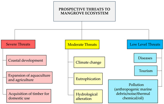 The overall threats to mangroves have been categorised into three groups based on D. Alongi’s classification of threats [209] (Figure 5). Among them, coastal development, expanding aquaculture and agriculture, and the acquisition of timber for domestic use are severe threats [210]. Climate change, eutrophication, and hydrological alteration are considered moderate threats [211], and diseases, tourism, and pollution (noise/thermal/chemical/oil) come under low-level threats to mangrove ecosystems [212].