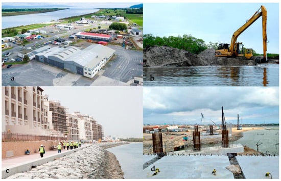 Coastline development activities in different regions. (a) Warehouse construction in Herald, New Zealand; (b) mangrove creek dam construction in Mangrove Cay, Bahamas; (c) resort construction in Abu Dhabi, UAE; and (d) port construction in Java, Indonesia. (Source: Coastline Stock Photos).