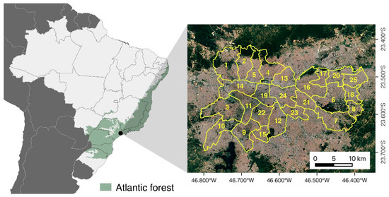 Localization of the study area with the 25 districts of São Paulo City, São Paulo State, Brazil.