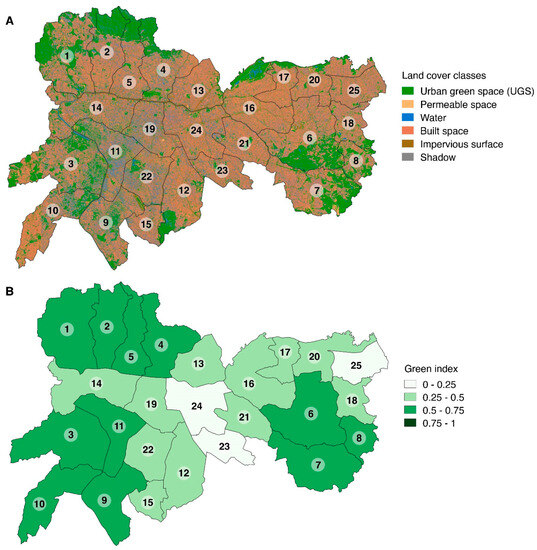 (A) Supervised classification map of 25 districts representing the cover classes of São Paulo City; (B) distribution of the green index.