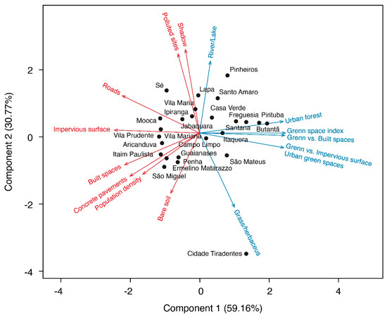The principal component analysis (PCA) was used to assess the interactions in each district between urban forests, grass/herbaceous areas, green spaces, permeable spaces, water, built spaces, roads, concrete pavements, other impervious surfaces, shaded area, green vs. impervious surface proportion, green vs. built space proportion, green index, population density, and contaminated sites. Contaminated sites were defined as environments composed of organic and inorganic elements with concentrations above the limits established by legislation, which could cause damage to human health and the environment.