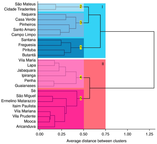 Average distances between clusters, districts with more urban green space covers and indexes (I), and districts with less urban green space covers and indexes, and thus higher priority for public policies (II).