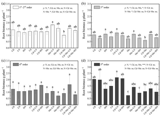 The effects of N addition, Cd pollution, and Mn pollution on the biomass of different root orders in Populus deltoides. (a) The 1st–2nd-order root biomass; (b) the 3rd-order root biomass; (c) the 4th-order root biomass; and (d) the 5th-order root biomass. Different lowercase letters above the bars represent significant differences between the treatments according to Tukey’s test (p < 0.05). Values are given as mean ± SE (n = 3). The significance of ANOVA: N, the effect of N deposition; Cd, the effect of Cd pollution; Mn, the effect of Mn pollution; N × Cd, the interactive effect of N deposition and Cd pollution; N × Mn, the interactive effect of N deposition and Mn pollution; Cd × Mn, the interactive effect of Cd pollution and Mn pollution; N × Cd × Mn, the interactive effect of N deposition, Cd pollution, and Mn pollution. ns, not significant; * p < 0.05, *** p ≤ 0.001.