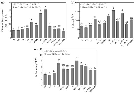The POD activity in the first two orders of roots of P. deltoides significantly increased under Mn pollution alone but not under Cd pollution alone or under their interaction. Under Cd pollution and Mn pollution alone, LN increased the POD activity in the first two orders of roots by 65.70% and 15.11%, respectively. However, no significant effect of N addition on POD activity was observed under combined pollution (Figure 2a). Additionally, the POD activity was significantly affected by N, Cd, and Mn as independent factors, their pairwise interactions, and the interaction of the three factors (Figure 2a).