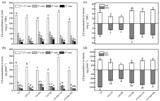 Cd accumulation in the roots decreased with increasing root order in all treatments with Cd pollution, and the highest Cd accumulation was observed in the roots of the first two orders. Compared to single Cd pollution, Cd accumulation in the first three orders of roots decreased significantly, while Cd accumulation in the 4th and the 5th orders of roots increased under the combined pollution. Under single Cd pollution, LN significantly reduced the Cd accumulation in roots of the 3rd and 5th orders, while HN significantly reduced the Cd accumulation in roots of the first two orders but significantly increased the Cd accumulation in the other orders of roots. Under the combined pollution, LN increased Cd accumulation in roots of the first two orders and the 4th order but decreased Cd accumulation in the 5th order (Figure 3b). Similarly, HN also increased Cd accumulation in roots of the first two orders but significantly reduced Cd accumulation in the remaining orders of roots.