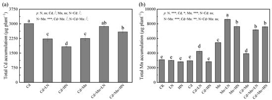 When compared to single Cd pollution, the total Cd accumulated in P. deltoides was remarkably reduced by 25.35% under the interactive pollution. Under Cd pollution alone, the total accumulated Cd decreased by 26.01% and 39.21% with the addition of LN and HN, respectively. However, under the interactive pollution, LN and HN induced a significant increase in the total accumulated Cd by 27.59% and 15.10%, respectively (Figure 4a). In addition, the amount of Cd accumulated in the stem was significantly affected by N as an independent factor. The amount of Cd accumulated in the 3rd-order roots was significantly affected by Mn as an independent factor. The interaction of N × Mn significantly affected the amount of Cd accumulated in the 1st–2nd orders of roots, stems, and leaves, and the total amount of Cd accumulated in P. deltoides (Table S3, Figure 4a).
