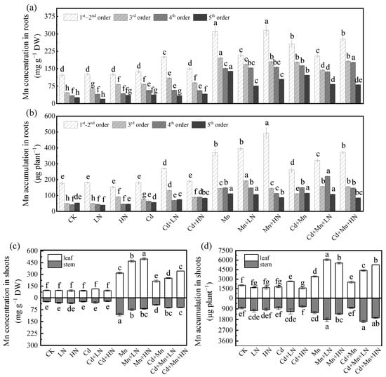 In addition, Cd concentration in all root orders (except 1st–2nd-order roots), stems, and leaves was significantly affected by N and Mn as independent factors and their interactions except for Cd concentration in stems, which was not significantly affected by the interaction of N and Mn (Table S3).