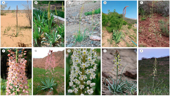 Eremurus M.Bieb. is one of the largest genera of Asphodelaceae Juss. [1], with 45 to 50 [2] or 59 [3] species of perennial, rhizomatous mesophytic plants. The genus is distributed in loess slopes and arid to semiarid mountainous areas in Central Asia, China, India, Pakistan, Afghanistan, Iran, Iraq, Lebanon, the Caucasus area, and Turkey [4,5]. Species of Eremurus are important as ornamental plants [6] and are called “foxtail lily” or “desert candle” because of their large and colorful inflorescence spikes [1]. They are also used in industry for products such as bio-oil [7] and adhesives [8], and some species within this genus are used as potential sources of drugs with antibacterial, anti-inflammatory, and antiprotozoal properties and have been traditionally utilized in medicine [9,10].