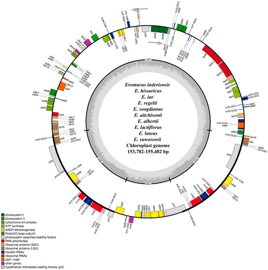 Chloroplast genome structure of ten Eremurus species. Genes shown outside the circles are transcribed clockwise, while those drawn inside are transcribed counterclockwise. Genes are color-coded according to their functional group.