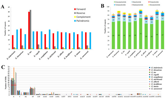 Chloroplast genome features of ten Eremurus species. SSR distribution (A); long repetitive sequences (B); type of SSRs (C).