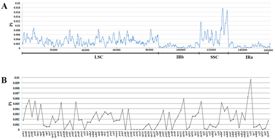 Nucleotide diversity (Pi) in whole chloroplast genomes (A); and in protein-coding genes (B) calculated using 85 shared genes in ten Eremurus species.