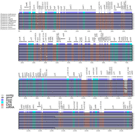 Comparison of the ten Eremurus chloroplast genome sequences using mVISTA. The genes are represented above. Genome regions are color-coded in the legend. The range of sequence similarity is presented in percentage (%).