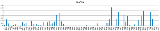 The synonymous (Ks) and nonsynonymous (Ka) substitution rates of the ten species in Eremurus ranged from 0.0000 to 0.025 (rpl36) and from 0.0000 to 0.0099 (ycf1), respectively. Among the 85 total protein-coding genes, the Ka/Ks values of rps19 (1.423), ycf1 (1.128), and ndhB (1.074) were under positive selection (ω > 1) (Figure 6 and Table S5). In addition, the ω-values ranged from less than 1 to 0.1 for 34.18% of the total protein-coding genes, whereas they were 0.095–0.01 for 10.59%. The remaining total protein-coding genes had no ω-values (Table S5).