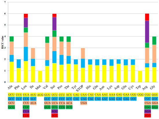 All 64 codons encoding 20 amino acids were detected (Figure 7). Two codons (AUU and AAA) occurred most frequently (>1000). The total number of codons detected ranged from 26,494 to 26,663 in E. lactiflorus and E. iae, respectively, while the number in E. aitchisoni, E. regelii, E. hissaricus, E. suworowii, E. luteus, E. albertii, E. inderiensis, and E. soogdianus was 26,655, 26,561, 26,560, 26,560, 26,558, 26,545, 26,528, and 26,528, respectively. The most common amino acid was Leucine (Leu), varying from 10.445% (2772) to 10.51% (2791). The frequency of cysteine (Cys) was the lowest at only 1.25% (333)–1.21% (323). Most codons demonstrated preferences except for AUG (Met) and UGG (Trp). Arginine encoding AGA (1.93) and AGC encoding Serine (≈0.29) had the highest and lowest RSCU values, respectively (Figure 7). A total of 33 codons had RSCU values > 1, of which three ended with G (UUG, AUG, and UGG), and 30 codons ended with A or U. The codons with an RSCU value less than 1 typically ended in C or G, except for UGA (stop codon), CUA, and AUA.