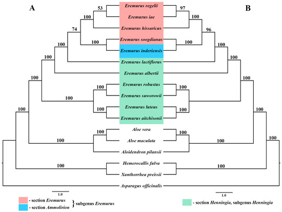 Phylogenetic trees of 17 species, including 11 Eremurus species using ML analysis based on 81 protein-coding genes (A) and complete cp genomes (B).