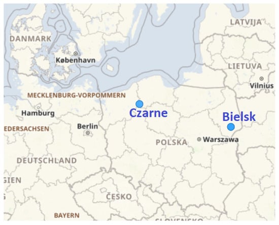 Map of Poland with marked locations of the experimental plots in FD Bielsk and Czarne Człuchowskie.