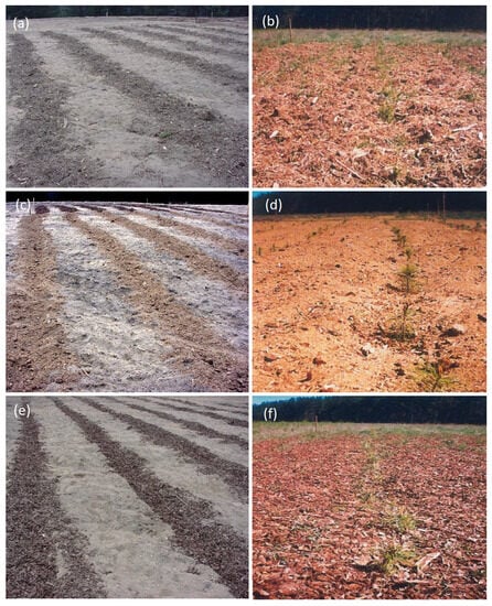 Photos of the trial plots with treatments applied to the soil surface. On the left—Bielsk, and on the right—Czarne Człuchowskie. (a,b) wood waste; (c,d) sawdust; (e,f) bark compost.