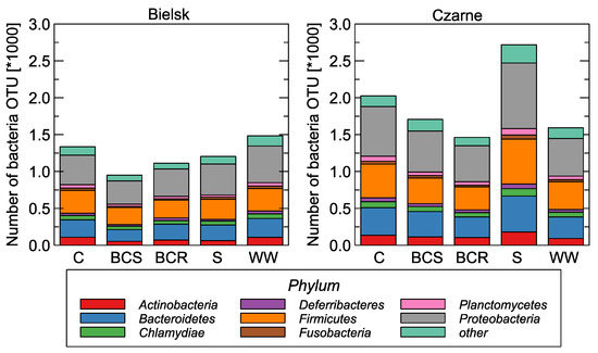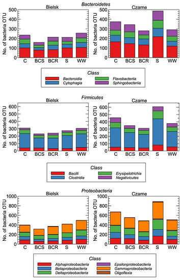 In the control plot in Bielsk, the bacteriome consisted mainly of Bacteroidetes, where 31 genera were found: Anaerophaga, Cnuella, Cruoricaptor, Fibrisoma, Fluviimonas, Gangjinia, Geofilum, Haliscomenobacter, Hydrobacter, Imtechella, Leadbetterella, Macellibacteroides, Microbacter, Mongoliitalea, Mooreia, Mucinivorans, Namhaeicola, Nubsella, Ornithobacterium, Perexilibacter, Petrimonas, Phocaeicola, Portibacter, Pseudofulvibacter, Rikenella, Rubrivirga, Rudanella, Salinirepens, Sporocytophaga, Tangfeifania, and Tannerella), 43 genera of Firmicutes: (Alkalibaculum, Allisonella, Allobaculum, Anaerospora, Butyricicoccus, Caminicella, Cellulosibacter, Dehalobacter, Desulfitibacter, Desulfonispora, Dolosicoccus, Eggerthia, Eremococcus, Ezakiella, Fastidiosipila, Fuchsiella, Gallicola, Gelria, Geothermomicrobium, Gracilibacter, Guggenheimella, Halanaerobaculum, Holdemanella, Hydrogenibacillus, Hydrogenoanaerobacterium, Ignavigranum, Johnsonella, Moryella, Negativicoccus, Oxobacter, Parvimonas, Pelospora, Peptococcus, Pilibacter, Proteiniborus, Selenihalanaerobacter, Sharpea, Soehngenia, Solobacterium, Sporanaerobacter, Syntrophothermus, Thermicanus, Tuberibacillus) and 46 genera of Proteobacteria (Amylibacter, Antarctobacter, Arsenophonus, Bilophila, Brackiella, Candidatus Carsonella, Coxiella, Craurococcus, Dehalospirillum, Desulfobacca, Desulfonatronobacter, Desulfosalsimonas, Desulfospira, Echinimonas, Endobacter, Enhygromyxa, Extensimonas, Ferrovum, Gilliamella, Halospina, Hydrogenovibrio, Isochromatium, Methylorosula, Methylosphaera, Moellerella, Nicoletella, Oligoflexus, Parablastomonas, Paralcaligenes, Parapusillimonas, Pelagibaca, Porticoccus, Pseudobacteriovorax, Psychrobium, Pyxidicoccus, Quatrionicoccus, Seminibacterium, Smithella, Spiribacter, Spongiispira, Stenoxybacter, Syntrophorhabdus, Telmatospirillum, Thermodesulforhabdus, Thiohalophilus, Woodsholea).