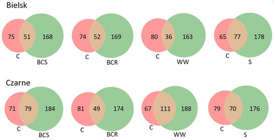 Venn diagrams showing the number of common bacterial genera between the studied soil variants at the Bielsk and Czarne sites: control (C), bark compost under the roots (BCR), bark compost on the surface (BCS), wood waste (WW), and sawdust (S).
