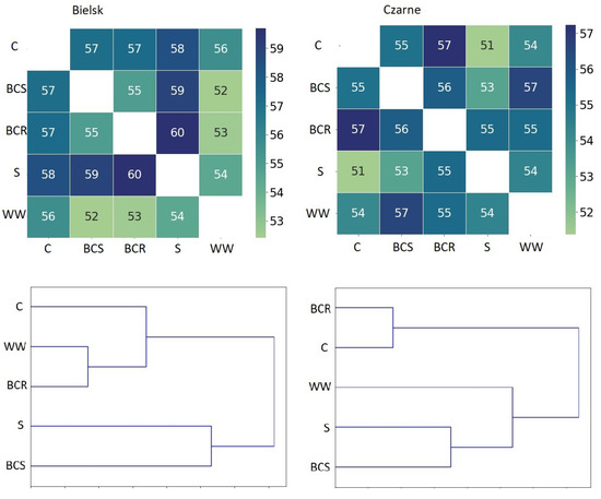 Similar changes in the bacteriome were found after the addition of other organic material in Bielsk and Czarne Człuchowskie. The addition of organic matter (BCS, BCR, WWW and S) increased the number of bacterial genera in each case compared to the control (C), and this was true for both poor and rich soil conditions Figure 5. The analysis of the similarity index showed that, at both sites, the greatest changes in the bacteriome composition occurred after the addition of sawdust and bark compost below the surface (Figure 6).