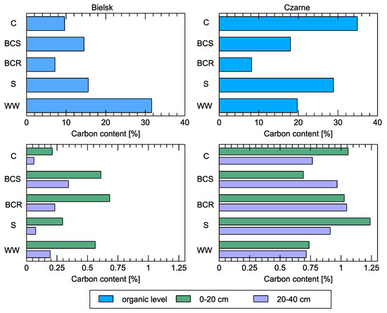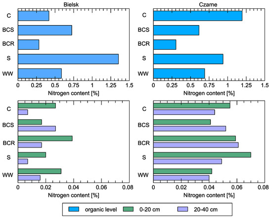 The nitrogen content of the soil also improved, but only at the worse station of the Bielsk observation plots (Figure 8). Large nitrogen contents were obtained after soil improvement with sawdust (S) in the organic layer in Bielsk and the superficial zone in Czarne (up to 20 cm depth). Application of various organic components to the plot in the Bielsk forest district resulted in soil enrichment (compared to control conditions), especially of organic carbon and nitrogen, in both the organic and mineral horizons. In the organic horizon, the organic carbon and nitrogen content was highest in the experimental plot in the Bielsk forest district (where wood waste was applied), with 31.6 and 1.35%, respectively; the organic carbon and nitrogen content was also higher in the variants with bark compost and sawdust than in the control. The nitrogen content in the 0–40 cm thick layer of the soils under control conditions was only 0.02%.