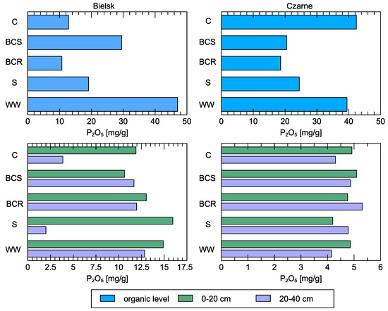 The phosphorus content of the organic horizon of the untreated soils was low in Bielsk and high in Czarne (Figure 9). Wood waste (WW) was the main source of P in the created organic layer, especially in Bielsk.