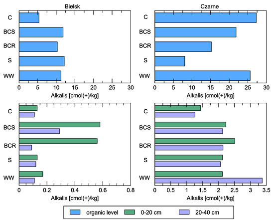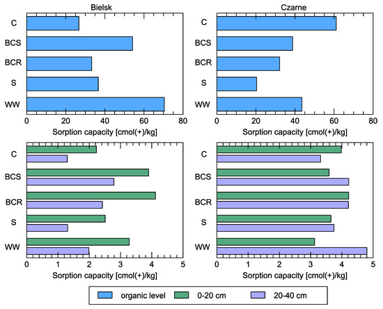 The reaction of the soil to the addition of organic matter had a positive effect on increasing the sum of exchangeable bases in the poor site in Bielsk, while no such reaction was observed in the organic layers of the rich plot in Czarne (Figure 10). In soils up to a depth of 40 cm, only one visible reaction occurred in practically all the variants studied (BCR, BCS, S, and WW). In the latter case, it was strongest at a depth of 20–40 cm and half as strong as in the control.