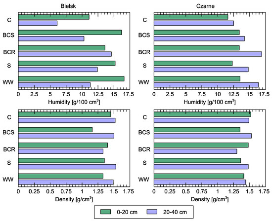 Currently, there are clear differences in soil moisture and density between plots (Figure 12). The volume density in the 0–20 cm thick soil layer of the plots in the Bielsk forest area was highest in the control variant (C) with 1.45 g/cm3. In the other variants, the volume density was lower and ranged from 1.35 (BCS variant) to 1.48 g/cm3 (BCR variant).