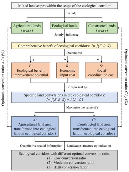 As an inherent part of the landscape ecological network (LEN), the ecological corridor is the bridge between ecological sources and also the key to ensuring urban ecological security. Existing studies on ecological corridors mostly stay in the large scale of landscape patterns and lack guidance for corridor structure design or optimization at the land use level. To provide a reference for the internal landscape structure adjustment of the ecological corridor composed of hybrid land use in the rapidly urbanized areas, first, we constructed the “Comprehensive benefit index of ecological corridors I” by using the three indexes of “Ecological benefit enhancement potential”, “Economic input cost” and “Social coordination cost”. Second, with the goal of maximizing the comprehensive benefits of the three aspects of ecological corridor construction, we established a functional relationship between the converted agricultural land area A, constructed land area C, and index I to determine the optimal proportion of agricultural lands and constructed lands converted into ecological lands within the planning scope of the ecological corridors. The results show that (1) according to the conversion ratio, the ecological corridors in the study area can be divided into three degrees of conversion rate: low, moderate, and high. (2) Among the 66 ecological corridors, the agricultural lands in 26 ecological corridors and the constructed lands in 35 ecological corridors need to be converted into ecological land at a high ratio to ensure the comprehensive benefits of the corresponding corridors. We also put forward suggestions for landscape structure adjustment and optimization for ecological corridors with different conversion degrees. This method can help balance the benefits of different stakeholders in the city and implement the results of ecological corridor planning on a large spatial and temporal scale at the land use level.