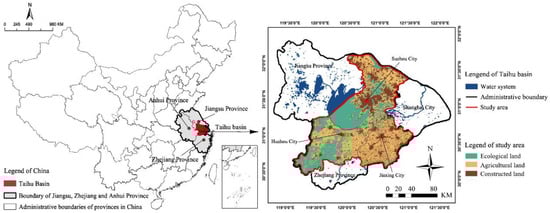 The Su-Jia-Hu area is a collective term referring to the cities of Suzhou, Jiaxing, and Huzhou. It is part of the Greater Taihu Lake Urban Agglomeration, with each city located to the east or south of Taihu Lake. Suzhou is situated in Jiangsu Province, while Jiaxing and Huzhou are located in Zhejiang Province (please see Figure 2). The Su-Jia-Hu area has a total area of 18,221 km2 and a permanent population of 18,315 million. The region enjoys convenient transportation located at a prime geographical position and is situated in the heart of the Yangtze River Delta urban agglomeration. It is in close proximity to major metropolises such as Shanghai, Nanjing, and Hangzhou and, therefore, benefits from the influence radiated by Shanghai. The Su-Jia-Hu area is located in the Taihu Lake Basin and is characterized by a network of rivers and abundant aquatic ecosystems. The overall river density in the region exceeds 1.5 km/km2. As an integral part of the Taihu Lake Basin, the water bodies and other ecological lands within the Su-Jia-Hu area provide essential ecosystem services for urban areas. Since the initiation of economic reforms and opening-up, the Su-Jia-Hu area has undergone rapid urbanization, accompanied by substantial economic growth and population expansion. Today, it has emerged as one of the most developed areas in China, characterized by robust investment growth and vibrant social development [45].