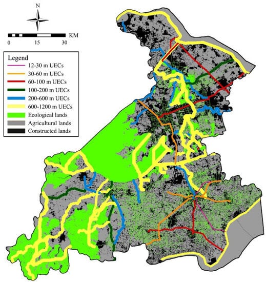 Spatial distribution of 66 ecological corridors and their widths in Su-Jia-Hu area (source: [34]).